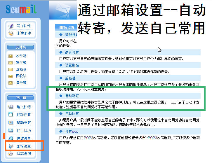 3、在邮箱系统中通过自动转寄功能发送自己常用邮箱