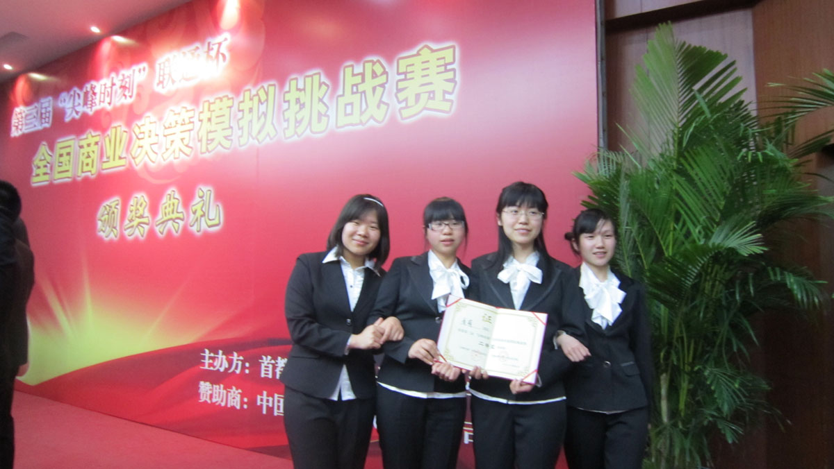 best365官网两支本科生参赛队伍自20101112参加初赛以来,与来自北京大学、清华大学、中国人民大学、对外经济贸易大学、中山大学、深圳大学、中国科学技术大学、大连理工大学、东北大学和吉林大学等全国80多所院校的近400支队伍、近千名学生同场竞技,一路过关斩将。经过近4个月的激烈竞争,全国有16支队伍闯入决赛,best365官网两支队伍都以小组第二名的成绩晋级决赛,并获得二等奖。
