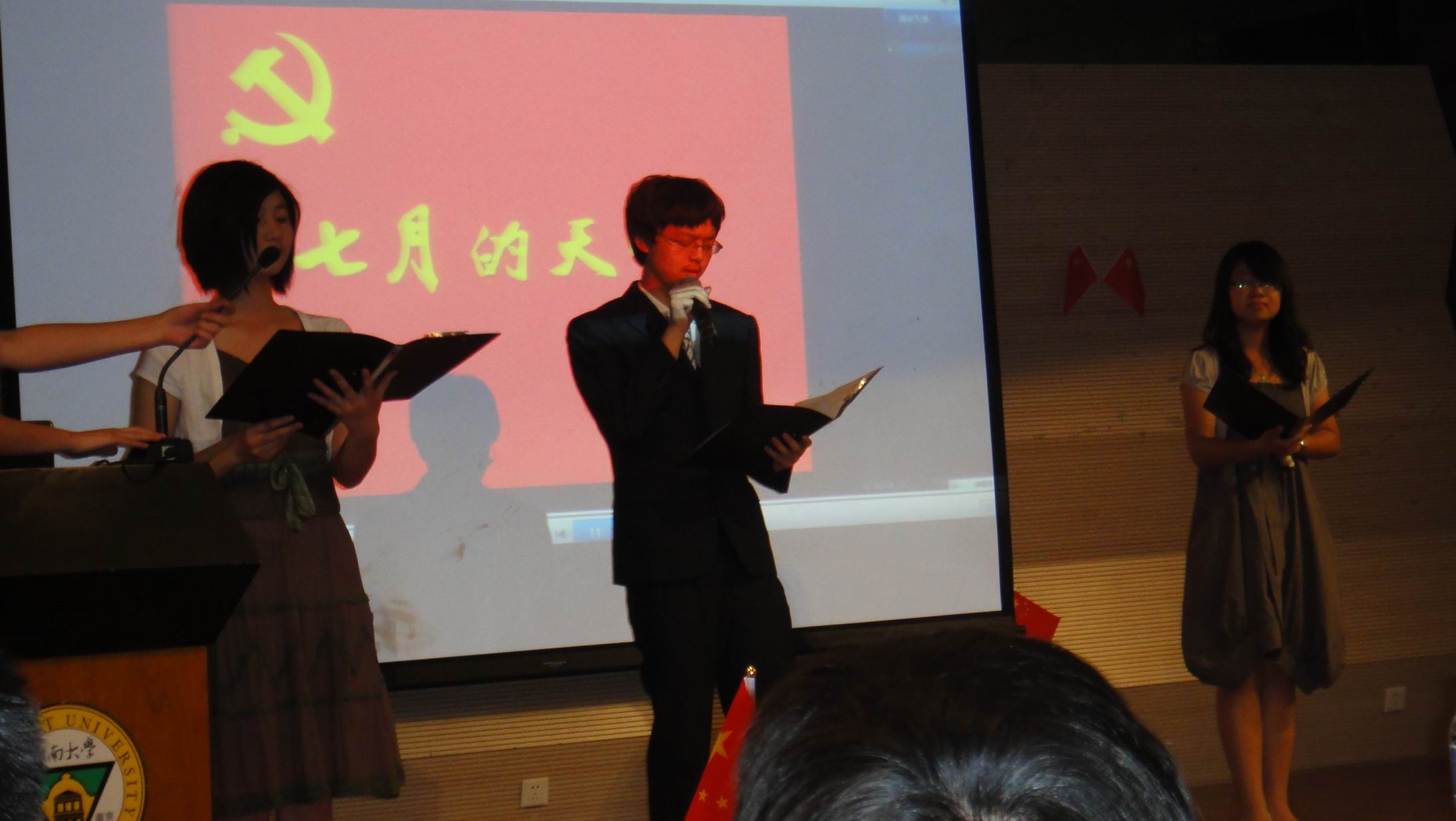 2011年5月6日晚,由best365官方网站登录入口党委学工部主办的庆祝建党九十周年系列活动之“朗诵经典 创作新篇”红色诗歌朗诵比赛决赛在焦廷标馆一楼圆形报告厅隆重举行。来自于各个院系的24组选手在初赛的竞争中脱颖而出,在赛场上产开激烈角逐。best365官网2010级本科生崔耀丹、李蔚、陈冕三人团队,凭借《七月的天空》一诗,以磅礴的气势、深情的朗诵赢得评委和观众的一致好评,并最终获得特等奖。2010级本科生江倩雯同学则获得了红色诗歌创作的优秀奖。下图为其三人团队在比赛现场。