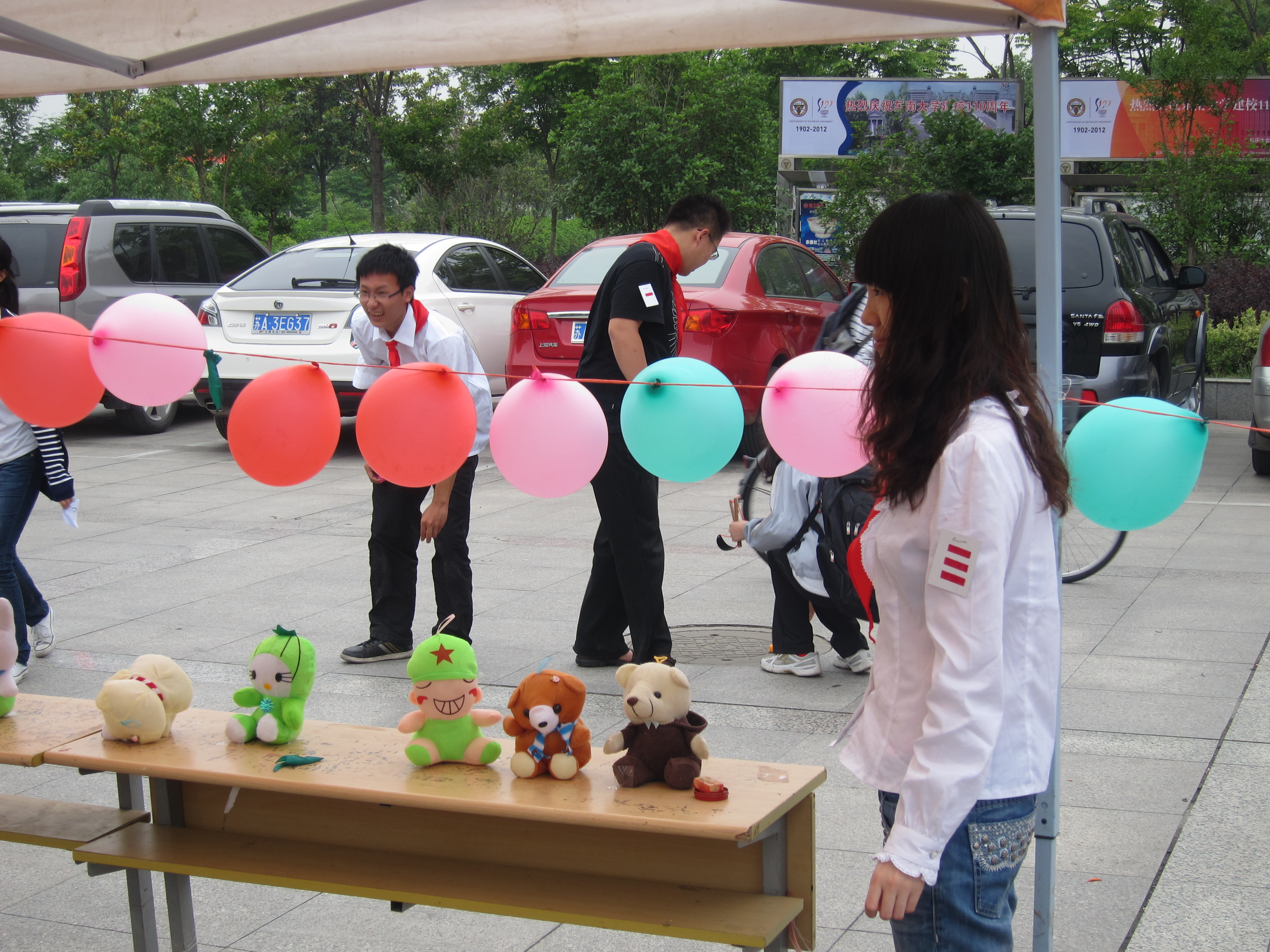 活动共设计了四个童年游戏环节,分别是:智慧珠、战斗陀螺、弹弓打玩偶、弹弹珠,每完成一个游戏任务就能得到一枚盖章,参与者可凭所得印章获得相应奖品。同时在中央区域设立有展区,向同学们展示童年的图书、玩具和零食。在下午三点到六点的活动时间里,各游戏区和展区一直人头攒动,参与活动的同学们络绎不绝。活动即将结束时下起了小雨,现场还有许多同学沉迷于游戏之中,流连忘返。同学们乐在游戏的同时并没有忘记送上对母校110周年校庆的祝福,大家主动在横幅上、便利贴上写下了自己对母校的祝愿和对未来的期望。