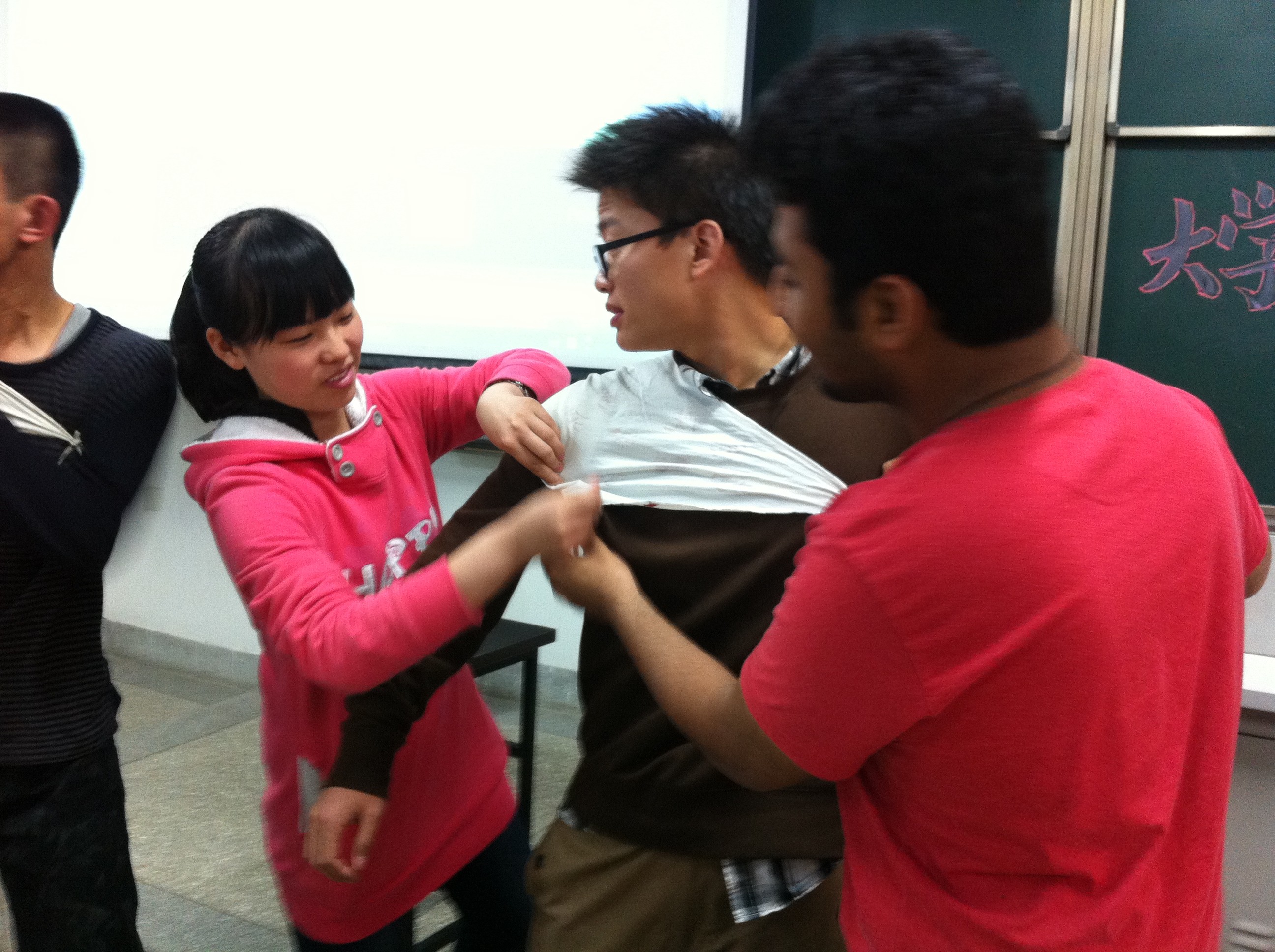 理论讲解由美国心脏病学会创设的成人心肺复苏方法切入,作为基础性扫盲,张老师配合相应的按压演示,很快把大家带入急救现场。随后详细介绍的四项基本急救技能,包括止血、包扎、骨折固定和搬运,张老师都让同学们上台,以亲历事故现场的方式一一呈现。其中,包扎环节许多同学想当然地以密集裹缠的形式对伤口进行堵塞,细心的张老师指出这种包扎方法的不合理性,可能压迫血管或引发二次感染,辅以解说和演示,张老师手把手教会了大家正确的包扎技巧。此外,张老师还根据其多年从业经验,和同学们就如何做好平日的身体保健进行了有益的分享。