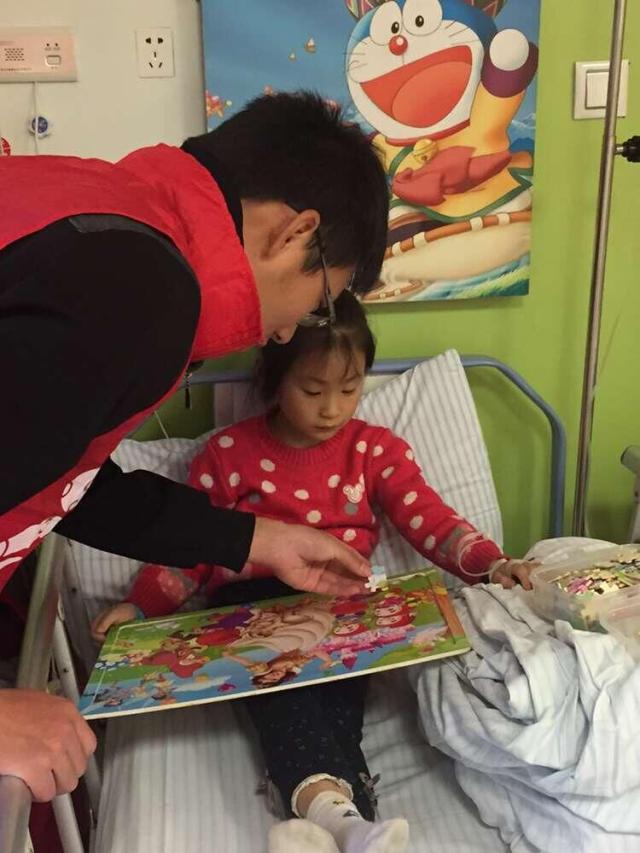 一个不寻常的周日下午,孩子们也格外活泼,互相嬉戏。他们刚从午觉中醒来,在志愿者的陪伴下来到了保护中心玩耍嬉戏。看到桌上摆着诱人的画笔和拼图,孩子们迫不及待地动起手来,在志愿者的陪同下,他们细心的描摹着图案和认真的学习拼图,有调皮捣蛋的,也有乖巧听话的,他们享受着这其中的乐趣,志愿者们也乐在其中。此时此刻,医院里多了几分欢笑声,看到孩子满脸的笑容,志愿者们感到心里暖暖的。