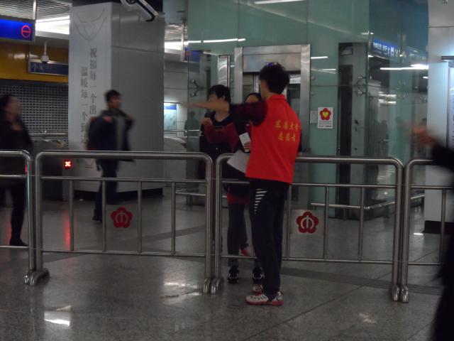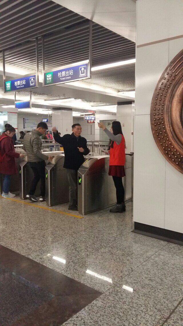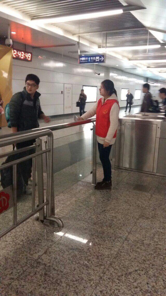 伴着初冬的寒意与稀疏的小雨,没有抱怨与放弃,准时集合的志愿者们一起出发,开始了新的服务任务。十二点,换好衣服,整装待发,第一批志愿者开始了活动。尽管天气不太好,但地铁内工作人员说,这是地铁内人流量最大的时段,所以大家也会稍微辛苦些。十足的暖气,匆忙的人群,热情的志愿者,这一切显得和谐而温馨。售票处,大家有序排队,志愿者帮助操作不熟练的乘客进行购票,那一抹红色在人群中耀眼而生动;出站口,人来人往,或悠闲,或急切,志愿者细心地为他们指路、投票卡。