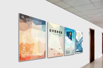 经管楼是展示学院风采的重要窗口,走廊过道自然而然就变成了体现学院整体内涵以及文化积淀的载体。走廊过道的学科灯箱展板巧妙的利用其贴近大家生活的优势,加大了我们对学院的关注度和接受熏陶的主动意愿程度,同时也可以增加整体的美感。