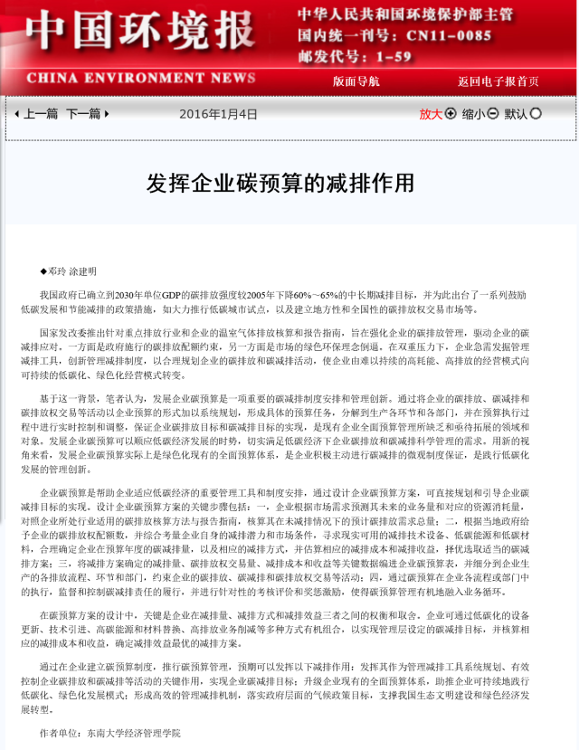 best365官网会计学硕士生邓玲以第一作者身份与导师合作撰写的文章《发挥企业碳预算的减排作用》,发表于全国性报刊《中国环境报》(2016年1月4日第2版)。该文章基于国家低碳经济转型和企业碳减排压力的背景,提出将发展企业碳预算作为一项重要管理工具和制度安排,帮助企业提高减排绩效和适应低碳经济发展的要求。文章阐述的企业碳预算发展思路和企业碳预算的减排作用,对于区域与企业减排工作的开展具有启发性。该文迅速被“中国环境网”、“中国大气网”、“中国绿色碳汇基金会”、“低碳工业网”、“中国碳排放交易网”、“中国气候变化信息网”、“中国环境保护产业协会”等20多家网络媒体全文转载。