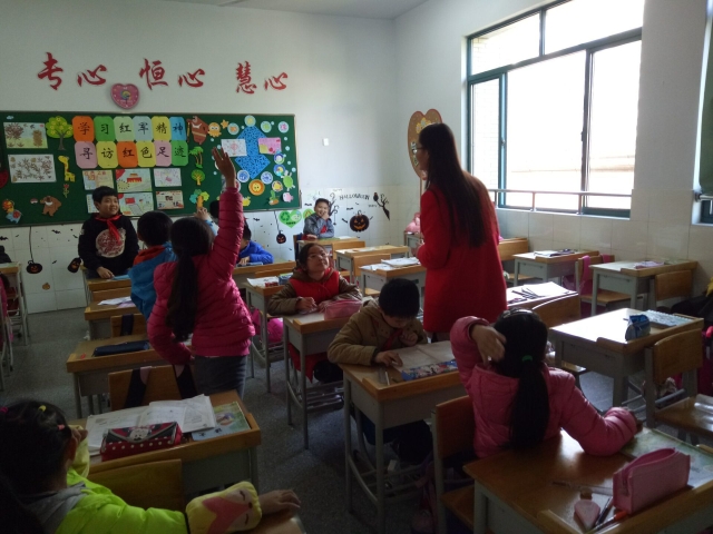随着上课铃响,志愿者们分成两组,分别进入了两个教室。初次见面都是激动而愉悦的,小朋友们热情地欢迎志愿者,志愿者也积极地回应他们。