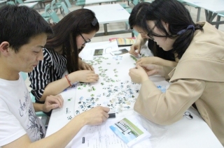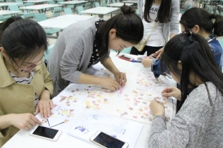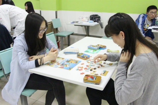 拼图比赛正式开始,经过40分钟齐心协力的合作与热闹非凡的讨论,由四个心灵手巧的女生组成的小组最先完成拼图作品。
