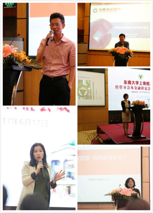 同时,为了体现金融联谊会的特色,现场举办了一场高水平的金融主题报告会,报告会由校友钟星航主持。报告会上,94级校友、东方证券资产管理公司固定收益投资部董事总经理李武向与会校友介绍其在证券板块固定收益的投资观点和心得;94级校友、中银基金风险管理部副总裁张凌做了有关基金板块的专题报告,报告的内容包括公募基金市场的基本情况、基金公司投研和风控体系介绍、监管热点和行业趋势分析;86级校友、建行信用卡中心副总经理张伟向大家做了银行板块的专题报告,报告的主题是我国消费金融发展与商业银行实践,主要内容包括消费金融发展背景、国外消费金融发展基本情况、当前我国消费金融业务发展、商业银行消费金融实践以及对商业银行发展消费金融业务策略思考;协力投资主管合伙人陈妍芝向大家做了投资板块的专题报告,陈妍芝校友的报告向我们展示了她不仅仅是投资人,更是有温度的创业合伙人;中泰信托研究发展中心高级研发经理王珍向各位校友做了信托板块的专题讲座,王总向大家介绍了信托的主要模式、目前信托在市场的定位偏差、信托对金融市场的贡献以及其未来的发展方向。