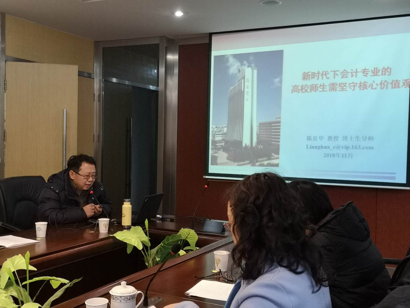 院党委委员、财务与会计党支部陈良华老师立足当代社会经济形势,为党员同志们讲授题为“新时代下会计专业的高校师生需坚守核心价值观”的专题党课。