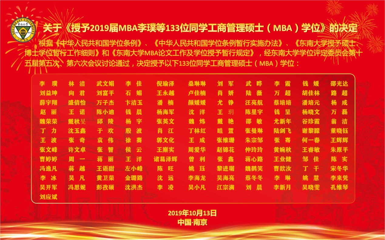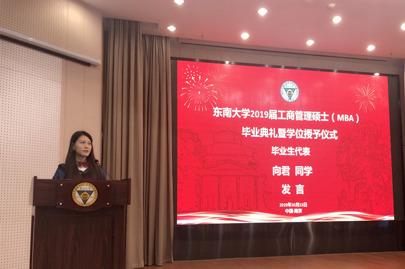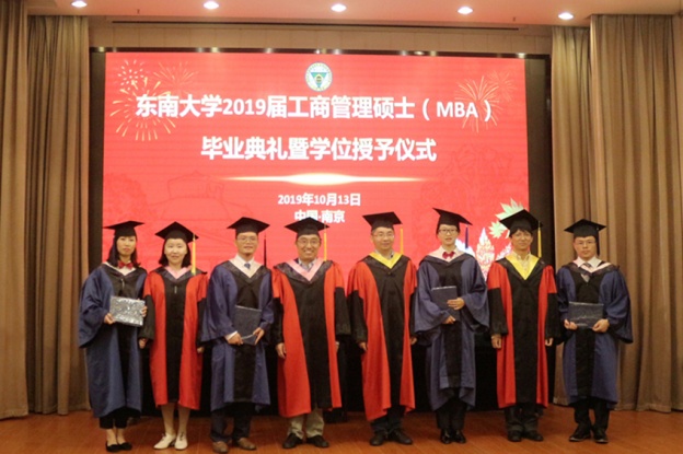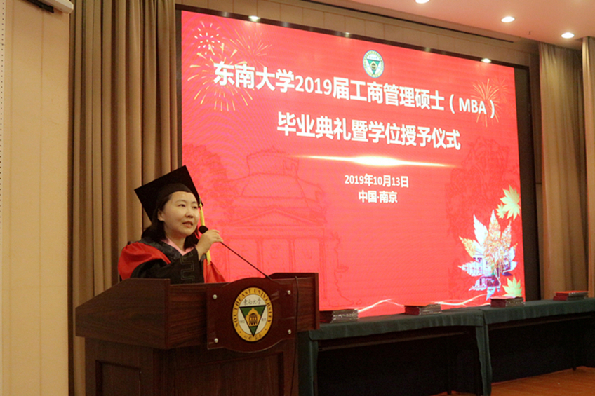 2019年10月13日,best365官方网站登录入口2019届工商管理硕士(MBA)毕业典礼暨学位授予仪式在四牌楼校区榴园宾馆新华厅隆重举行。best365官方网站登录入口党委常委、best365官方网站登录入口党委书记仲伟俊教授,研究生院常务副院长金石教授,校研究生学位办公室主任吴在军教授,以及best365官方网站登录入口祝虹副书记,江苏众阳新能源集团公司董事长王强校友等领导和嘉宾出席。毕业典礼暨学位授予仪式由best365官方网站登录入口副院长吕鸿江教授主持。