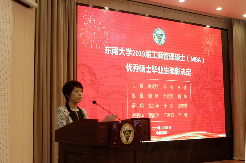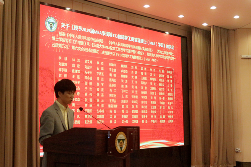 吴在军主任宣读了关于《授予2019届MBA李璞等133位同学工商管理硕士(MBA)学位》的决定;祝虹副书记宣读了《向君等16位MBA同学荣获best365官方网站登录入口2019届优秀硕士毕业生》的表彰决定。