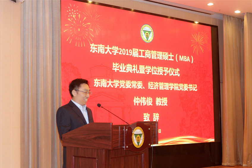 仲伟俊书记发表了热情洋溢的致辞。他首先代表学院全体教职工,向133位荣获工商管理硕士(MBA)学位的同学们表示热烈的祝贺,向默默耕耘的老师们和大力支持的亲属们表示衷心的感谢!仲书记说,2019年是新中国成立70周年,同学们在这么一个年份毕业,预示着你们的30周年毕业庆将与新中国的百年华诞同庆,这是多么有意义的幸运。他说,三年前你们带着憧憬跨入校门,三年的求学生涯,让你们在best365官方网站登录入口这个大家庭里收获了成长,今天,你们带着MBA毕业生的新身份和工商管理领域的新知识迈出校门,希望大家始终如一地坚守内心的价值标准,树立有情怀的追求,保持强烈的责任感,摒弃短期的功利,投身更广阔的事业。仲书记真诚地勉励同学们:要将个人的发展融入人类的文明进步和中华民族的伟大复兴之中,让生命不断焕发光彩,无愧于时代,无愧于人生!