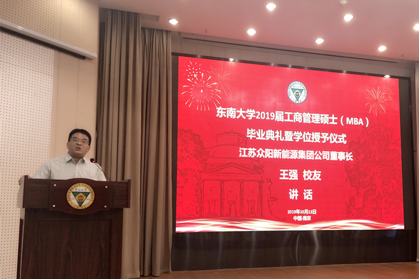 江苏众阳新能源集团公司王强董事长代表校友讲话。王强校友2004年MBA毕业,今天受邀重回母校,向学弟学妹们道贺!他说,止于至善,学习他人,完善自我,追求卓越,永远是best365官方网站登录入口校友们的努力目标。他说,当今时代,是一个寻找幸福的时代,是一个充满智慧的时代,我们要把学习当成一种生活方式。在他看来,校园教育就是用智慧和创新寻找自己的生活方式。他希望学弟学妹们在追求人生更高境界的征程中,始终不要忘记母校,常回家看看,为母校推进“双一流”建设进程,实现“1-10-100”东大梦做出自己的贡献。