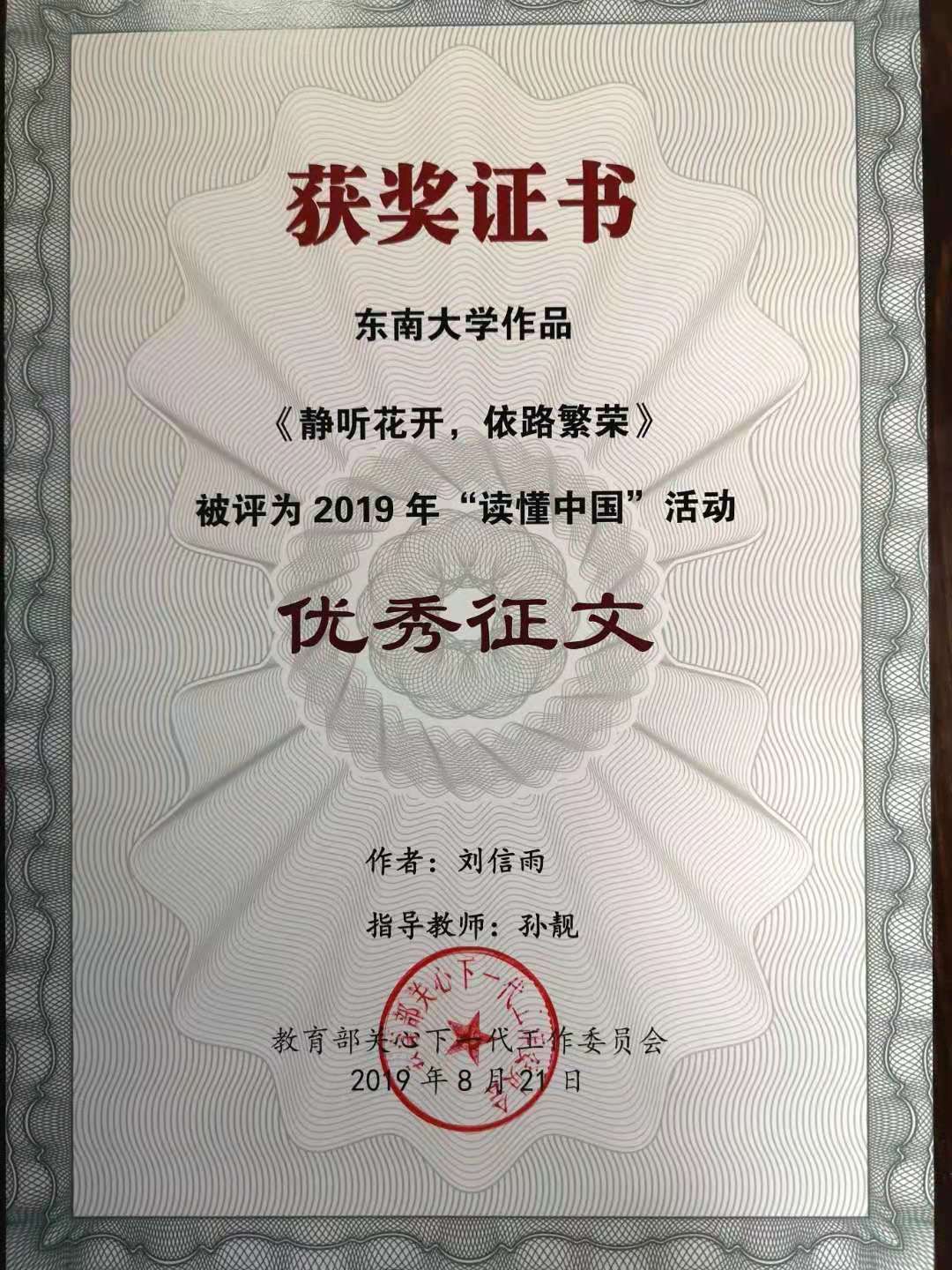 经过逐层评选,刘信雨同学征文作品《静听花开,依路繁荣》,记录与张开荣老书记夫妇的采访与感悟,作为我校唯一入选作品,被教育部关工委评委2019年“读懂中国”活动优秀征文。刘信雨同学、钟至绮的征文,陈鸿标组的视频,分别获得院级一、二、三等奖。