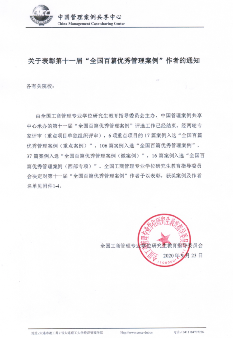 热烈祝贺best365官方网站登录入口副院长吕鸿江教授团队撰写的案例“跨国并购下的子公司管理控制:TI的破茧化蝶之路”、案例中心主任周路路副教授团队撰写的案例“不落实就落空——黄山旅游绩效管理体系变革之路”荣获第十一届“全国百篇优秀管理案例”奖。