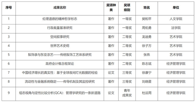 高等学校科学研究优秀成果奖(人文社会科学)为国内社科类最高成果奖,每5年评选2次。本届共有1539项成果获奖,其中:著作论文奖 1241 项,含一等奖 152 项;咨询服务报告奖 77 项,含一等奖 10 项;普及读物奖 20 项;青年成果奖201项。