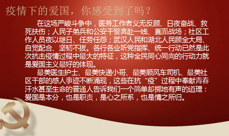 然后,她结合时事热点,以疫情下的人民为角度,说明了举国抗“疫”的现实环境就是爱国主义最生动的写照。