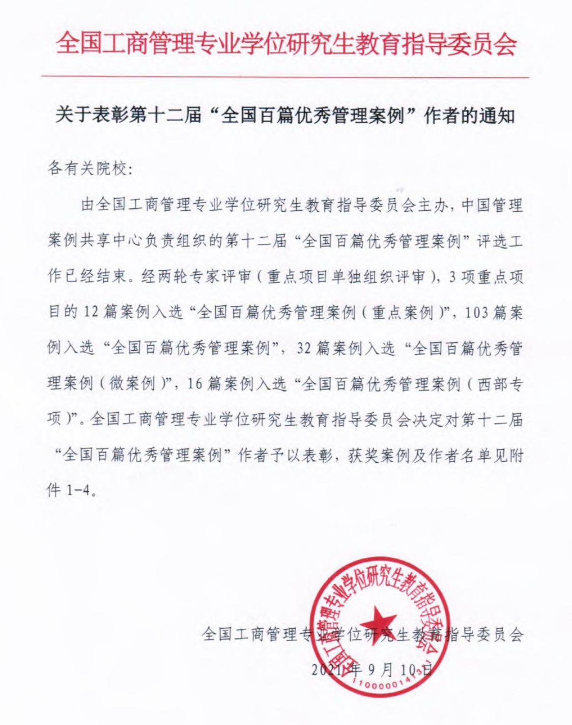 2021910日,由全国工商管理专业学位研究生教育指导委员会主办、中国管理案例共享中心负责组织的第十二届“全国百篇优秀管理案例”评选结果正式揭晓。我校best365官方网站登录入口本次提交的4篇案例均成功入选“全国百篇优秀管理案例”,创单次“百优”获奖历史新高。
