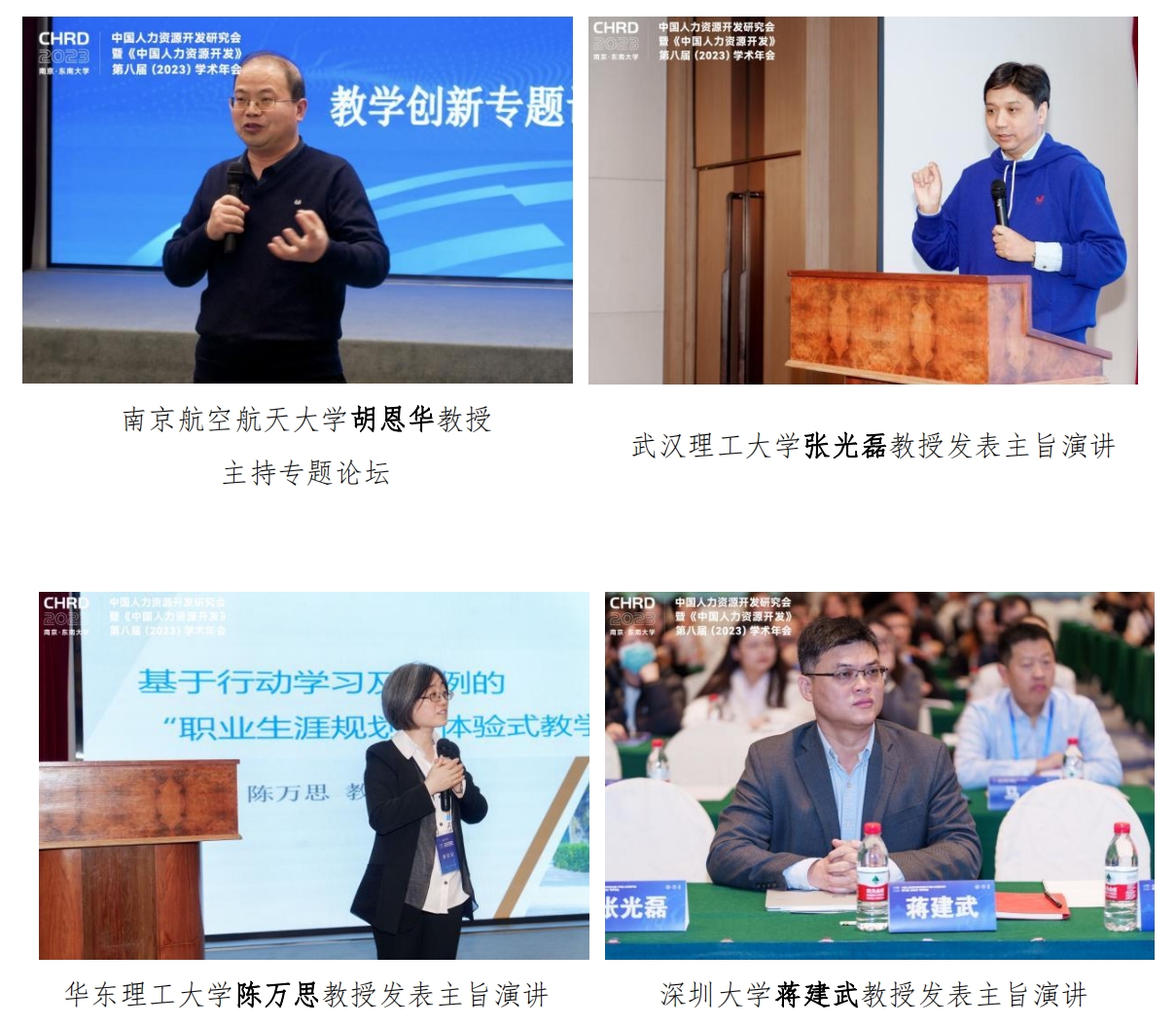 教学创新专题论坛由南京航空航天大学胡恩华教授主持。武汉理工大学张光磊教授、华东理工大学陈万思教授、深圳大学蒋建武教授围绕“教学创新与教学创新成果报告——全国教创赛经验分享”,“基于行动学习及案例的‘职业生涯规划’体验式教学设计”,“本科教学中的知识融合:文献、教材与实践”等主题分别进行了报告。
