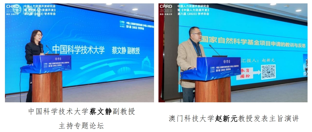 课题申请专题论坛由中国科学技术大学蔡文静副教授主持。澳门科技大学赵新元教授、中国社会科学院工业经济研究所高中华研究员围绕“国家自然科学基金申请的教训与反思”、“以人为中心的管理研究:新时代以及新情境下自科与社科的交叉融合”等主题分别进行了汇报。