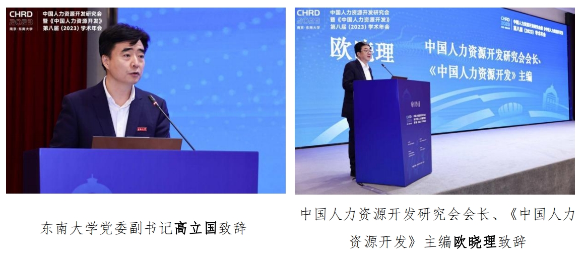 中国人力资源开发研究会会长、《中国人力资源开发》主编欧晓理致辞,对领导嘉宾、专家学者和老师同学表示热烈欢迎,结合会议主题“深入学习贯彻党的二十大精神,落实人才强国战略”及当前国内外复杂局势,总结了中国人力资源开发的重要历史节点,强调人才强国战略的重要意义,并预祝大会圆满成功。