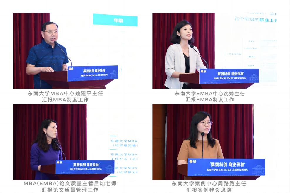 Director Yao Jianping of MBA Center, Director Shen Ting of EMBA Center, Lv Can, thesis quality supervisor, and Director Zhou LuLu of Case Center of Southeast University reported on the system construction, thesis quality management, case construction and other aspects of Southeast University's MBA (EMBA) respectively. MBA Center of Southeast University has strengthened the system construction in teaching management, faculty construction, thesis management, case construction and continuous development, and introduced a series of management measures, with a view to promoting the optimization of the internal governance mechanism and providing institutional guarantee for the high-quality development of MBA (EMBA) of Southeast University.