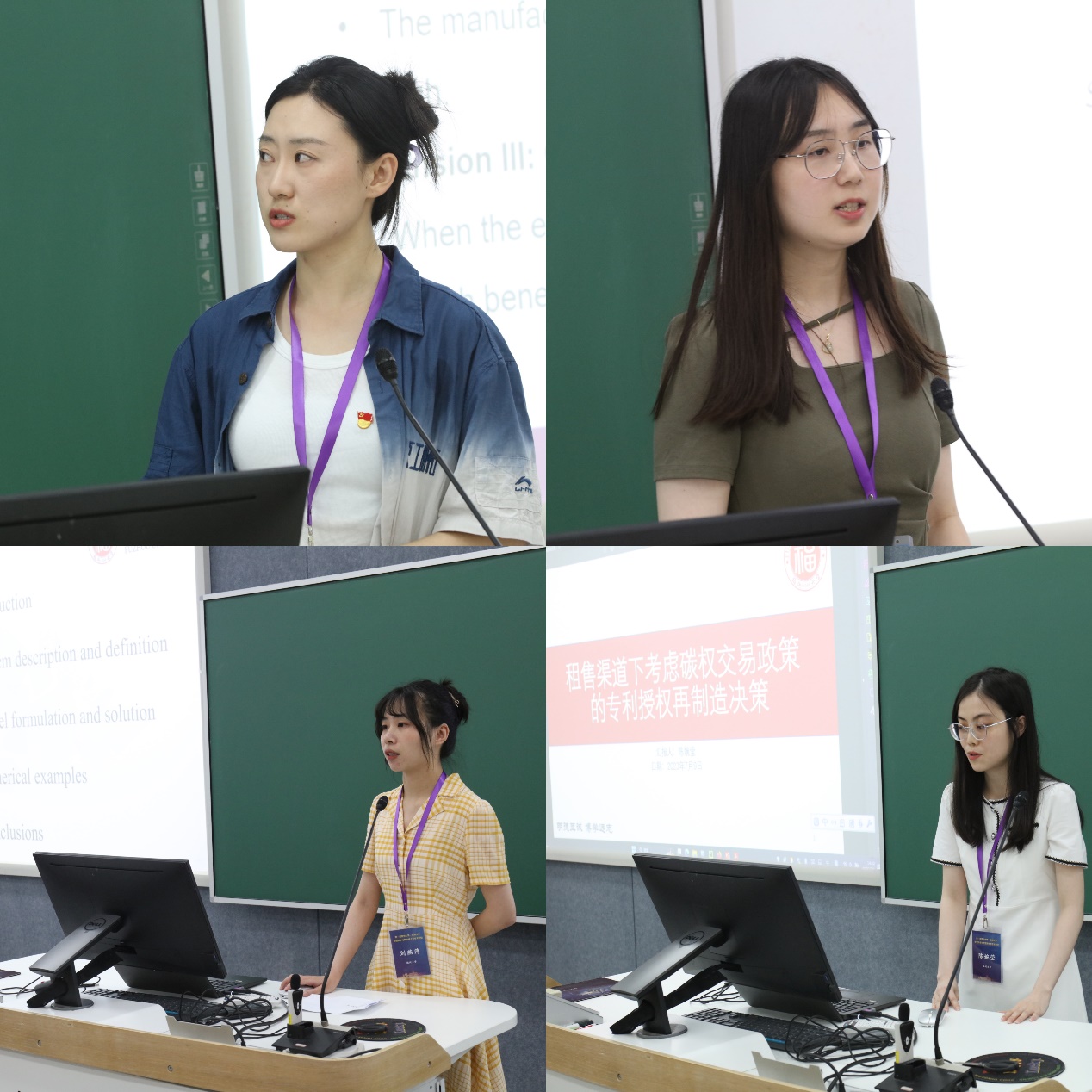 The academic forum was divided into four groups for presentations. Firstly, under the hosting of Professor Li Min, the "Operations and Green Supply Chain Management" group presented their findings. Four doctoral students, Pei Yiyin, Wu Mengchu, Liu Yanping, and Chen Wanying, reported on their research work from various aspects such as research background, research ideas, and model construction. Pei Yiyin, a doctoral student from Nanjing University, shared her research work on "Manufacturer Encroachment and Promotional Effort on a Hybrid Online Retailing Platform". She established a game theory model between manufacturers and retail platforms to explore the interaction between promotion effort decisions on hybrid retail platforms and manufacturer encroachment decisions. Wu Mengchu, a doctoral student from Southeast University, reported on her research work "Buy Online and Return Instore in Omnichannel Operations". She proposed a formalized model to evaluate the impact of omnichannel return collaboration on consumer behavior and channel profitability to provide consumers with a better shopping and returns experience. Liu Yanping, a doctoral student from Fuzhou University, shared her research on "Optimal Production and Maintenance Strategies for Manufacturing/Remanufacturing Leasing System Considering Uncertain Quality and Carbon Emission". She established a production maintenance decision-making model focused on maximizing lessor profits by considering the impact of the quality level of leased products on manufacturing and remanufacturing equipment and the remanufacturing rate to study decisions concerning the production and maintenance of the manufacturing/remanufacturing system. Chen Wanying, a doctoral student from Fuzhou University, presented her research work on "Patent licensing remanufacturing decision considering carbon trading policies under the lease-sale channel". She studied the patent licensing remanufacturing strategy under CTP's leasing channels, constructed a supply chain comprising OEM and TPR,  further analyzed the impact of CTP on OEM and TPR decision-making, and considered the production strategies and profit changes under information asymmetry.