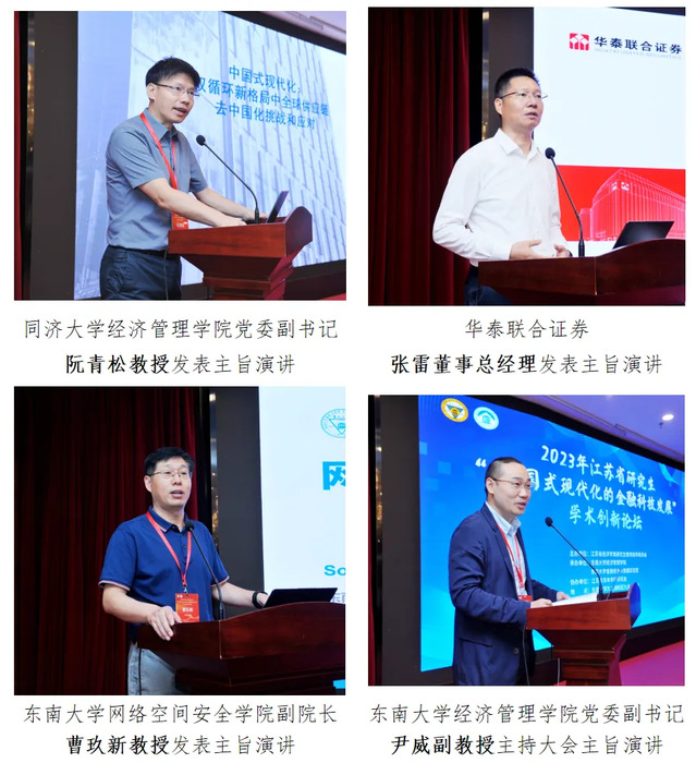 The second half of the keynote speech of the conference was presided over by Associate Professor Yin Wei, Deputy Secretary of the Party Committee of the School of Economics and Management at Southeast University. Professor Ruan Qingsong, Deputy Secretary of the Party Committee of the School of Economics and Management at Tongji University, General Manager Zhang Lei, Managing Director of Huatai United Securities, and Professor Cao Jiuxin, Deputy Dean of the School of Cyberspace Security at Southeast University, delivered keynote speeches. Professor Ruan Qingsong delivered a keynote speech entitled "New Pattern of Double Circulation in the Context of Chinese Path to Modernization". Professor Ruan deeply expounded on the development of Fintech in the perspective of double circulation around the internal logic of double circulation, the toughness and potential of double circulation, and the supply chain and industry in the perspective of double circulation. General Manager Zhang Lei delivered a keynote speech titled "The profound impact of Fintech on the securities industry". General Manager Zhang pointed out that Fintech has become the fundamental force for the evolution of the financial ecosystem in the securities industry and the strategic commanding point for creating organizational competitive advantages. It will profoundly change the business model, business structure, and operational system of the securities industry, and become the core driving force for the next strategic cycle of the securities industry. Professor Cao Jiuxin delivered a keynote speech titled "Online Financial Events and Multidimensional Evolution". This study designs a distributed financial network data sniffing system based on the Scrapy framework, obtains information related to online financial events from multiple channels, and comprehensively judges the security risks and multidimensional evolution mechanisms of online finance based on this.