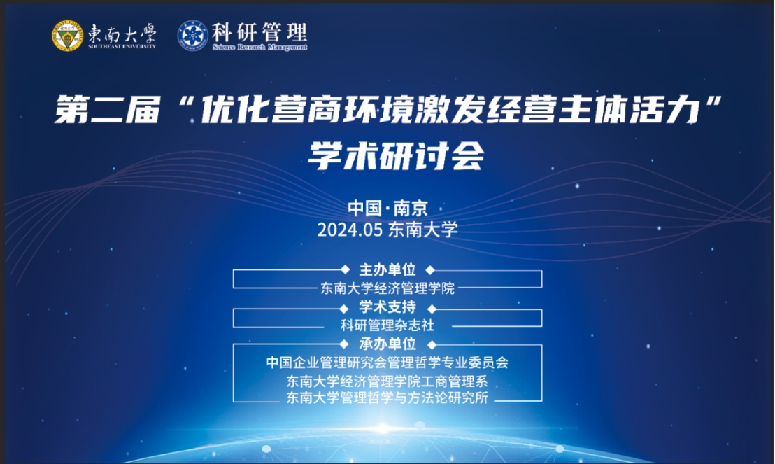 On May 18-19, 2024, the second academic symposium on "Optimizing the Business Environment to Stimulate Market Entities' Vitality" was successfully held at the Jiulonghu Campus of Southeast University, Nanjing. Academically supported by Science Research Management journal and hosted by the School of Economics and Management, the event was co-organized by the Management Philosophy Professional Committee of the Chinese institute of Business Administration, the Department of Business Administration, and the Institute of Management Philosophy and Methodology of Southeast University. The symposium gathered experts, scholars, and graduate students from various esteemed institutions, including the Development Research Center of the State Council, Jiangsu Provincial Committee of the Chinese People's Political Consultative Conference, Science Research Management journal, and renowned universities such as Ocean University of China, University of Chinese Academy of Sciences, Renmin University of China, China Agricultural University, Sun Yat-sen University, Zhejiang University, Xiamen University, Nanjing University, Fudan University, Wuhan University, University of Electronic Science and Technology of China, Northwestern Polytechnical University, Central South University, Northeastern University, Beihang University, Dalian University of Technology, Central University of Finance and Economics, Dongbei University of Finance and Economics, Zhejiang Gongshang University, Hohai University, Nanjing University of Aeronautics and Astronautics, Nanjing Normal University, Nanjing University of Science and Technology, Nanjing University of Finance and Economics, Nanjing University of Posts and Telecommunications, Henan University of Economics and Law, Anhui University of Finance and Economics, Hunan University of Commerce, Inner Mongolia University of Finance and Economics, Yunnan University of Finance and Economics, Shanxi University of Finance and Economics, and Southeast University.